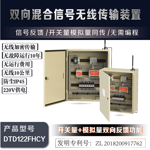 達(dá)泰1系DTD122FHCY雙向混合信號(hào)無線傳輸裝置[開關(guān)量模擬量無線傳輸模塊]“雙向”代表一個(gè)模塊上同時(shí)具備發(fā)射和接收的功能;所謂“混合信號(hào)”就是一個(gè)模塊上既有模擬量信號(hào),又有開關(guān)量信號(hào)。每臺(tái)無線傳輸裝置都可以同時(shí)采集標(biāo)準(zhǔn)4-20mA電流信號(hào)和開關(guān)量信號(hào),也可以對(duì)接收到的信號(hào)進(jìn)行反饋。整個(gè)系統(tǒng)是通過全數(shù)字無線加密方式,抗干擾能力強(qiáng),適用于工業(yè)現(xiàn)場(chǎng)等惡劣環(huán)境。該C型產(chǎn)品無線可靠傳輸距離可達(dá)3公里,同系產(chǎn)品最遠(yuǎn)可傳輸20KM以上。雙向混合信號(hào)無線傳輸裝置既可以實(shí)現(xiàn)點(diǎn)對(duì)點(diǎn)通信,也適合于點(diǎn)對(duì)多點(diǎn)而且分散不便于挖溝布線等應(yīng)用場(chǎng)合,不需要編寫程序,不需要布線,一般電工就可以調(diào)試使用。