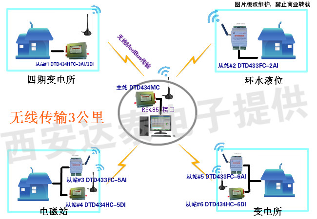 本次試驗,我們需要在這個車間放置一臺模擬量的無線傳輸終端從站和一臺四路開關(guān)量的無線傳輸終端從站,將模擬量數(shù)據(jù)和開關(guān)量數(shù)據(jù)可靠地傳輸?shù)?/span>500米外的值班室工控機內(nèi),通過組態(tài)軟件實現(xiàn)全自動的數(shù)據(jù)檢查和遠程控制。